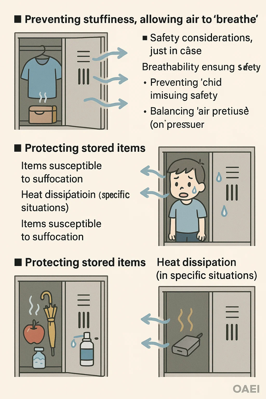 قابلیت تنفس ایمنی را تضمین می کند (یکی از مهمترین دلایل): این بسیار مهم است! در صورتی که کودک بدرفتاری کند یا به طور تصادفی خود را داخل کمد قفل کند (اگرچه نادر است، اما این یک مورد در طراحی است)، این سوراخهای کوچک جریان هوا را تضمین میکنند و از خفگی جلوگیری میکنند. فضای کاملاً مهر و موم شده و بدون سوراخ بسیار خطرناک است.